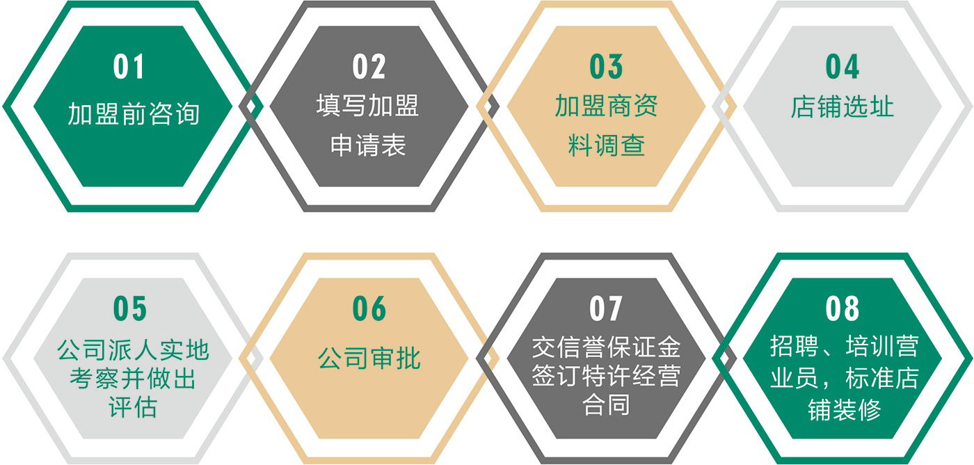 加盟意向 -->; 书面申请《形象店申请表》 -->; 加盟商调查 -->; 审批 -->; 确定合作方案 -->; 审批备案 -->; 签定加盟协议。